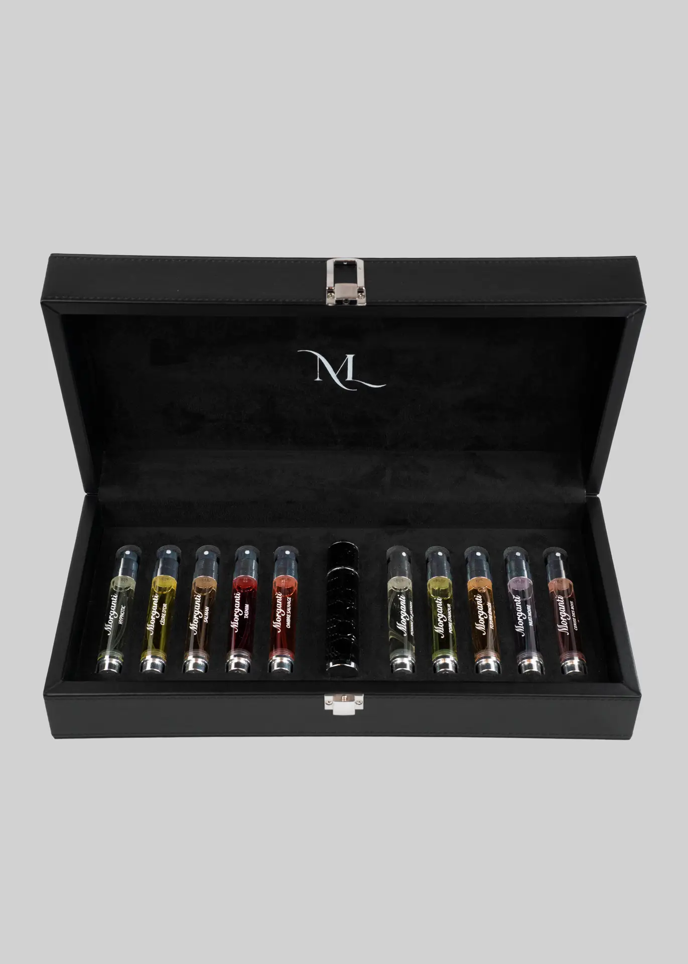 The complete discovery set gathers all ten Maison Morganti perfumes in refined 10ml form, accompanied by our handcrafted leather travel case. A full anthology of identity, memory, and mood — designed for those who do not choose a single scent, but live many.