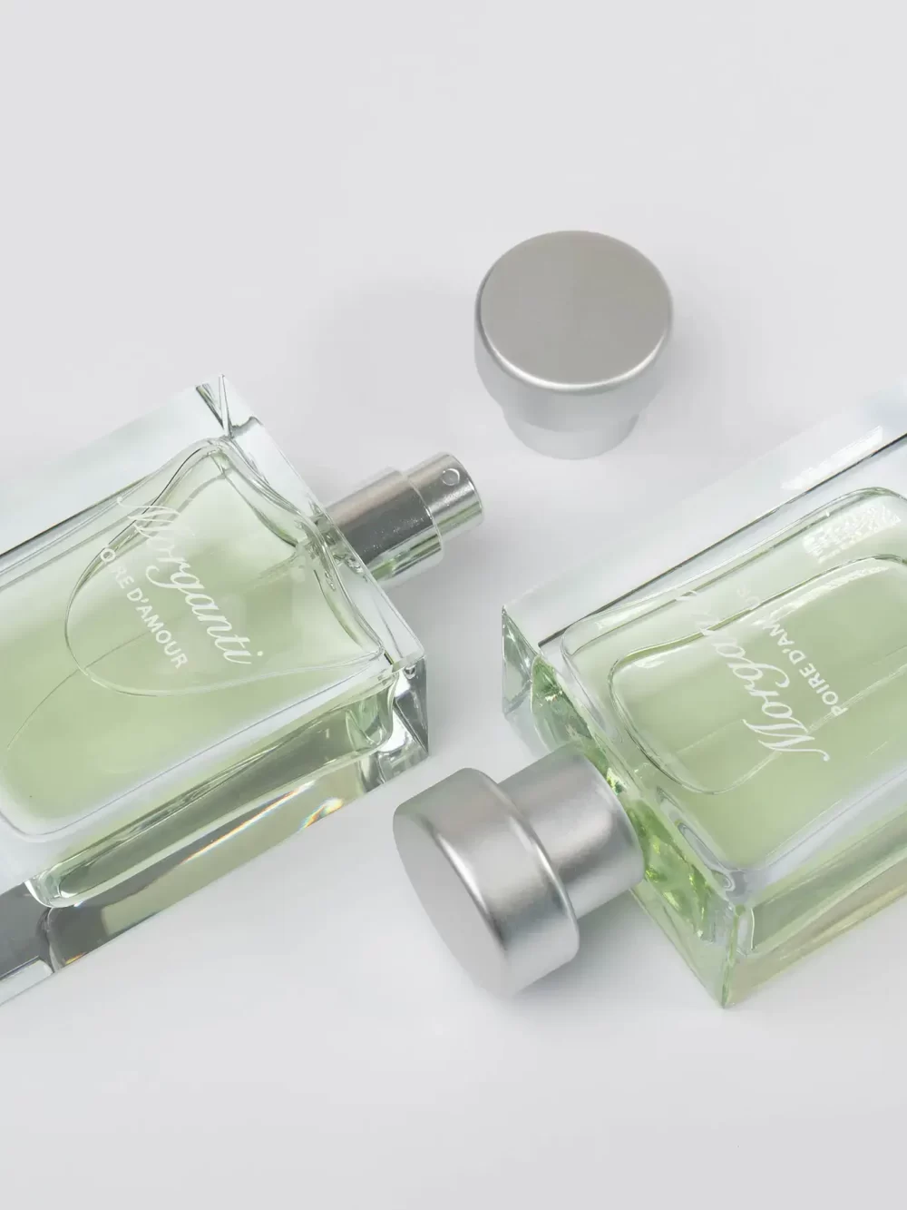 Poire d’Amour s’ouvre sur l’éclat juteux de la poire et du cassis, avant que le jasmin, l’iris et la fleur d’oranger ne se déploient comme une soie sur la peau. En fond, le praliné, la fève tonka et la vanille composent un sillage à la fois irrésistible et tendre.